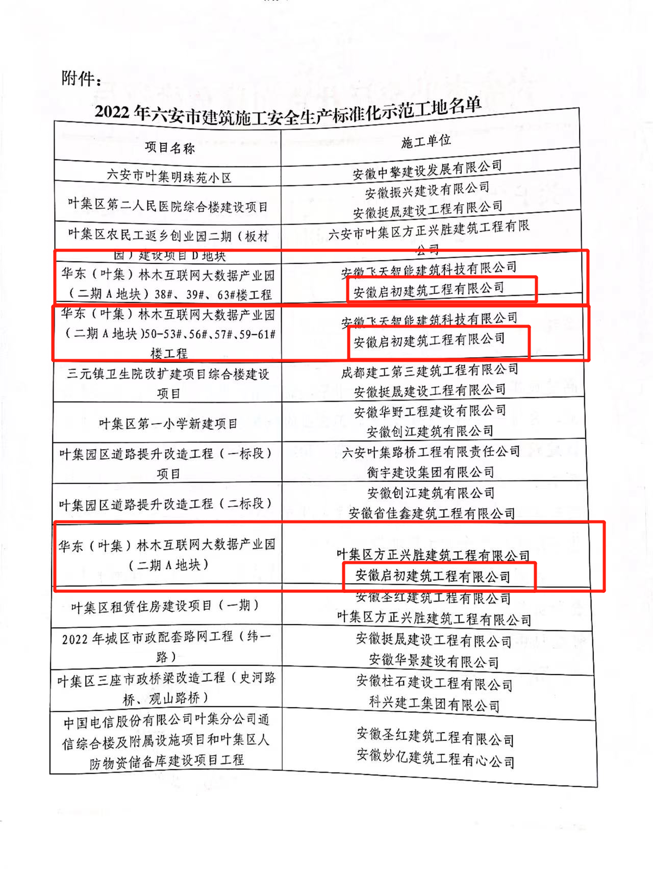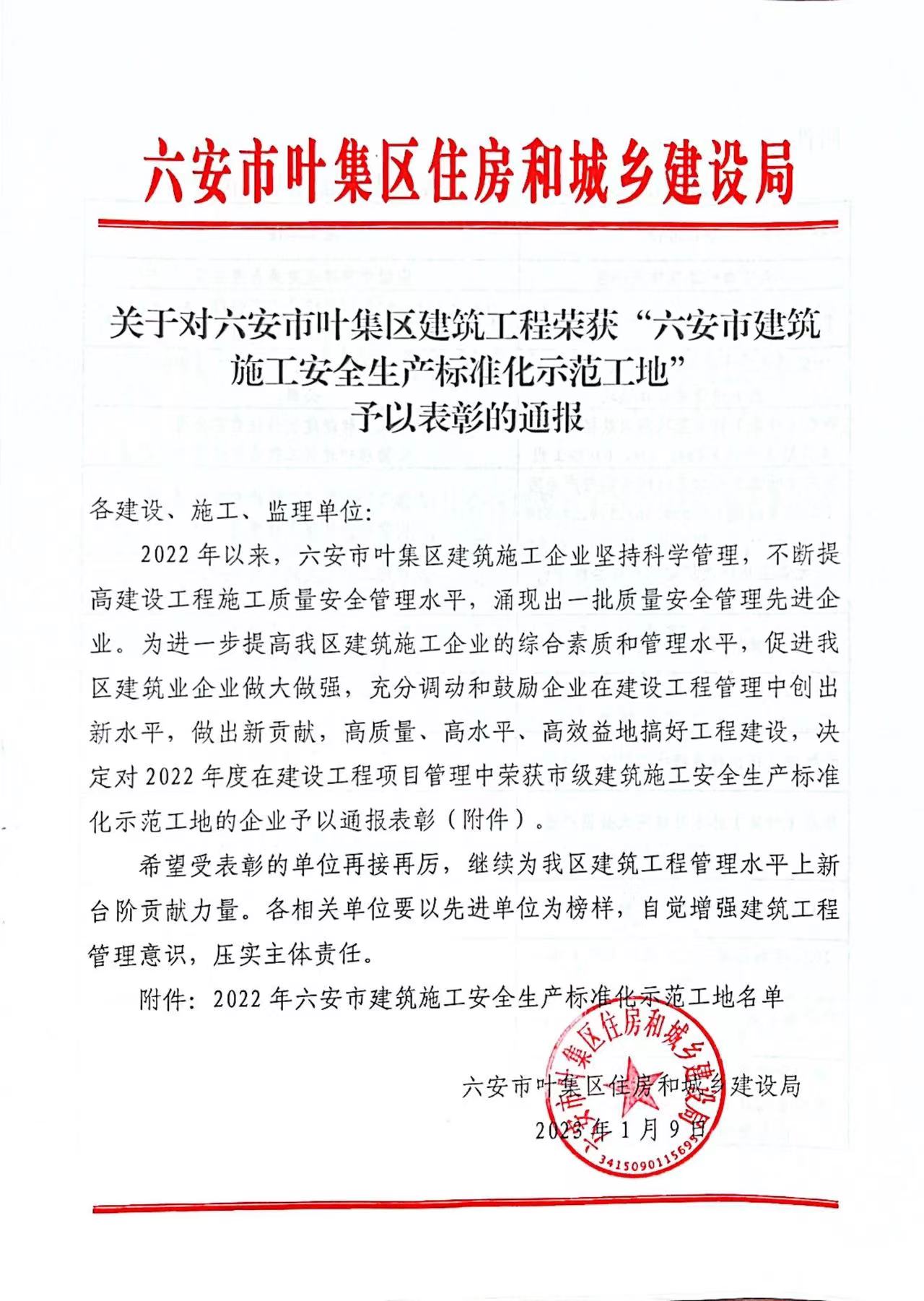 關(guān)于對(duì)六安市葉集區(qū)建筑工程榮獲“六安市建筑施工安全生產(chǎn)標(biāo)準(zhǔn)化示范工地”予以表彰的通報(bào)