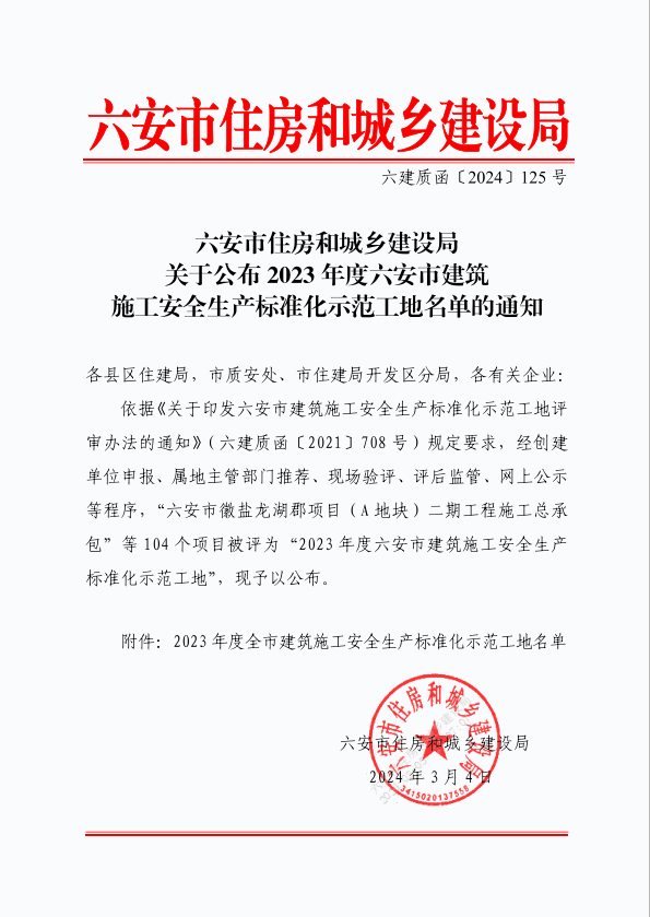 六安市住房和城鄉建設局關于公布2023年度六安市建筑施工安全生產標準化示范工地名單的通知